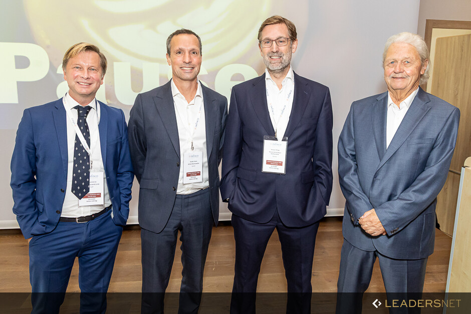 Joe Kaltschmid (ganz links) und Moderator Helmut Tenschert (ganz rechts) mit den Vortragenden Fabian Herdter (Mitte links) und Philipp Strasser (Mitte rechts) – Foto © leadersnet.at / C. Mikes